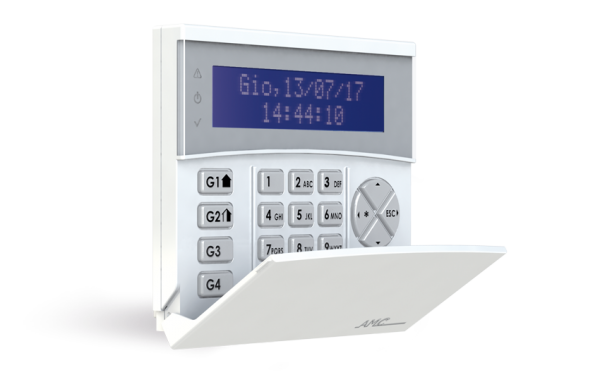 Clavier LCD avec afficheur à cristaux liquides rétroéclairé à 32 caractères sur deux lignes. Deux lignes configurables indépendamment comme entrées ou comme sorties; 3 LED de signalisation. Volet de protection. Touches programmables pour saisie rapide.